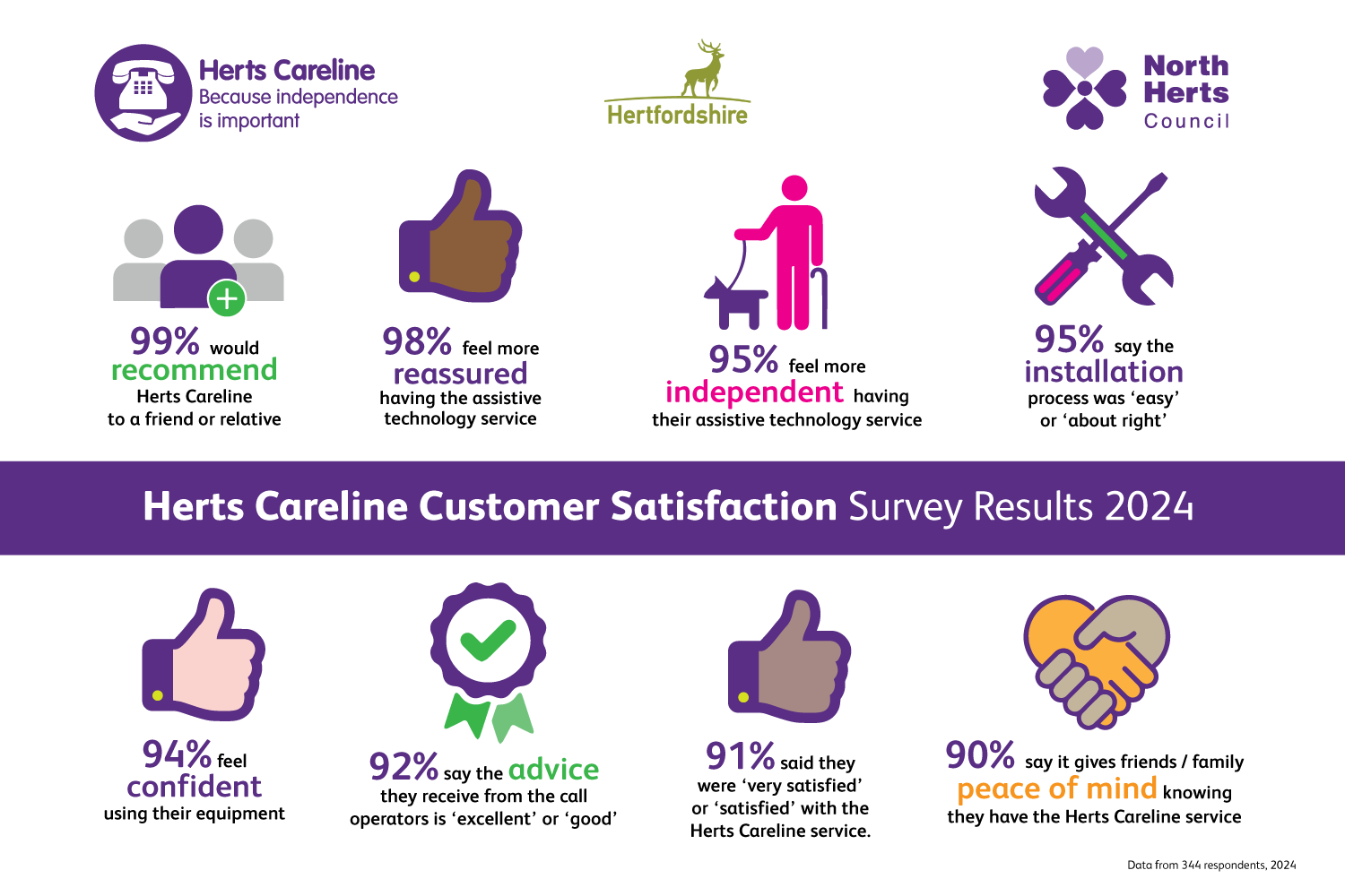 Cllr Tony Kingsbury, Executive Member for Adult Care, Health & Wellbeing at Hertfordshire County Council, said: “We’re very pleased to see this high level of satisfaction with the telecare services we commission from Herts Careline, and we’d like to thank all those at Herts Careline who are contributing to this great service for our residents, allowing them to remain independent and providing additional reassurance for families.”